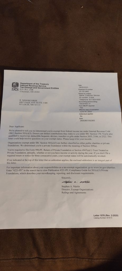 Il Misericorde is proud to announce that we have been approved by the Internal Revenue Service as a 501(c)(3) tax exempt entity for federal taxation purposes. This will allow for greater options for contributions from those interested in taking on public and private corruption in Missouri as well as allow for better tax outcomes for our donors.